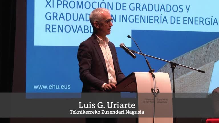 Deskribapena: Euskal Herriko Unibertsitateko Gipuzkoako Ingeniaritza Eskolako Eibarko ataleko Energia Berriztagarrien Ingeniaritza Graduko XI. promozioko titulatuen graduazio ekitaldia egin zen Eibarko Hezkuntza Esparruko Areto Nagusian.